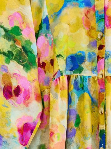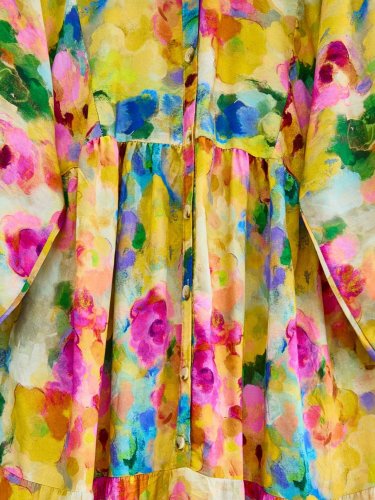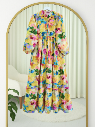 Karışık Desen Yarım Düğmeli Kolu Lastikli Elbise -Sarı