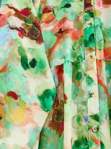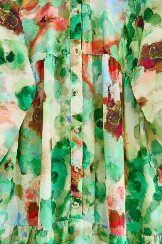 Karışık Desen Yarım Düğmeli Kolu Lastikli Elbise -Yeşil