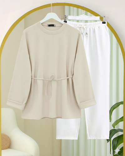 Kolu Katlı Beli Bağlamalı Yırtmaçlı Penye Tunik -Bej
