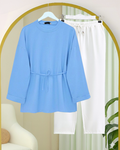 Kolu Katlı Beli Bağlamalı Yırtmaçlı Penye Tunik -Mavi