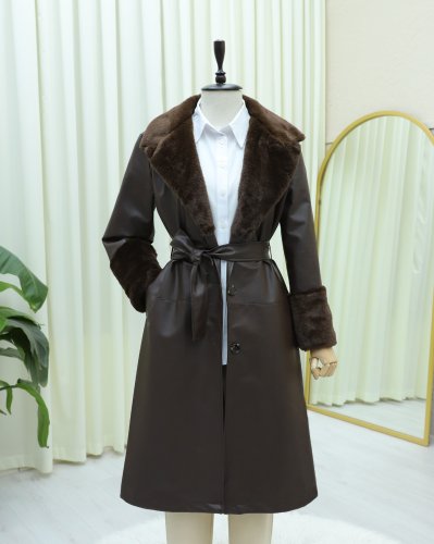 Kürklü Önü Düğmeli Kemerli Deri Pardesü -K. Kahve