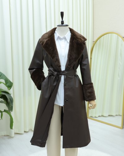 Kürklü Önü Düğmeli Kemerli Deri Pardesü -K Kahve