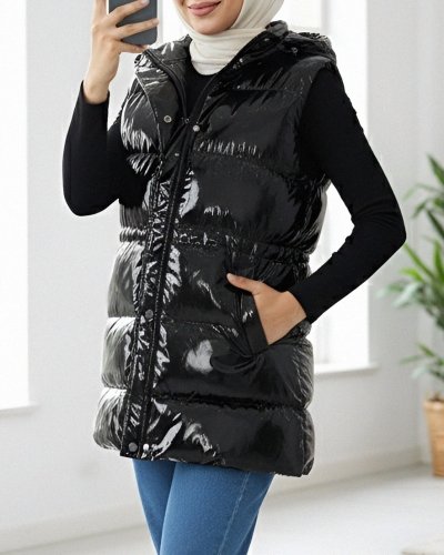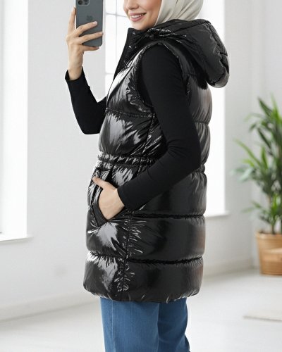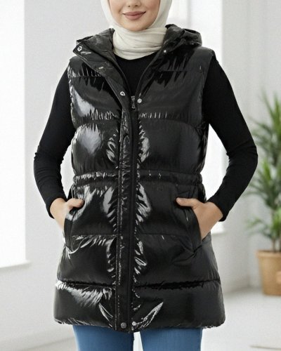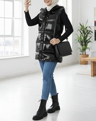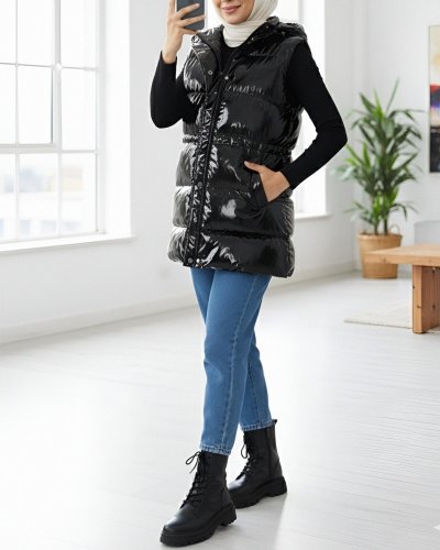 İçi Astarlı Önü Fermuarlı Cepli Rugan Yelek -Siyah