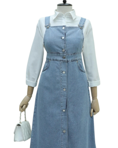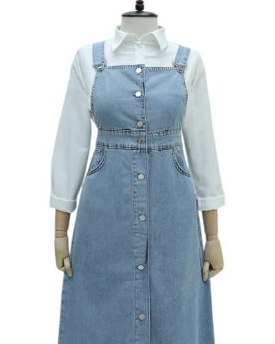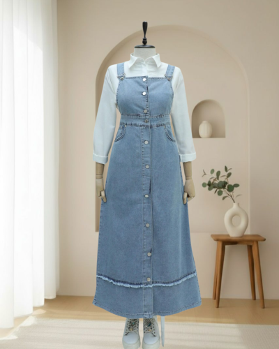 Eteği Püskül Detaylı Önü Düğmeli Cepli Kot Salopet -Buz Mavi