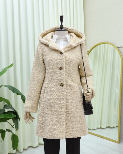 Kapşonlu Düğmeli Astarlı Peluş Kaban -Açık Vizon