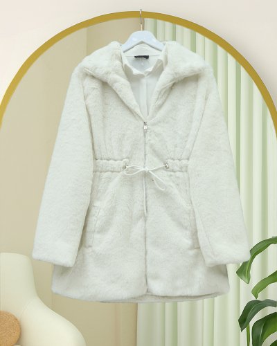 Tünel Bağcıklı Cepli Astarlı Kürklü Ceket -Ekru