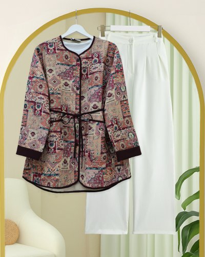 Kolu Katlamalı Beli Bağcıklı Etnik Desen Ceket -GKurusu