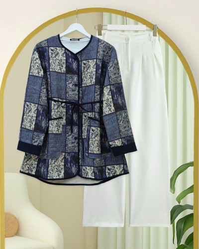 Kolu Katlamalı Beli Bağcıklı Etnik Desen Ceket -İndigo