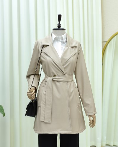 Tek Düğmeli Cepli Belden Bağlamalı Deri Trençkot -Krem