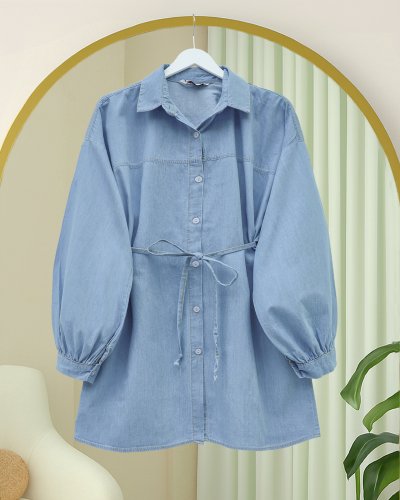 Düğmeli Beli Bağcıklı Kot Gömlek -Açık Mavi