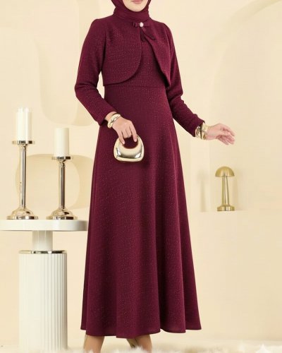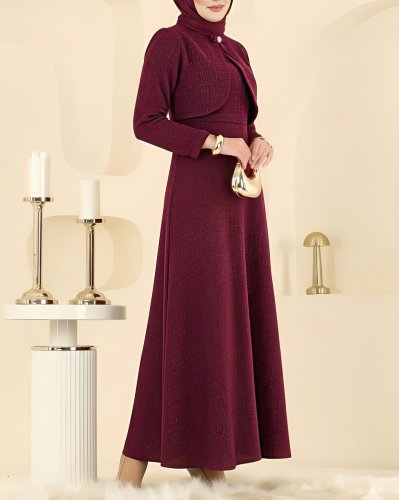 Ceket Detaylı Simli Broşlu Elbise -Bordo