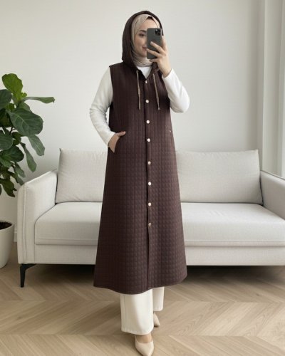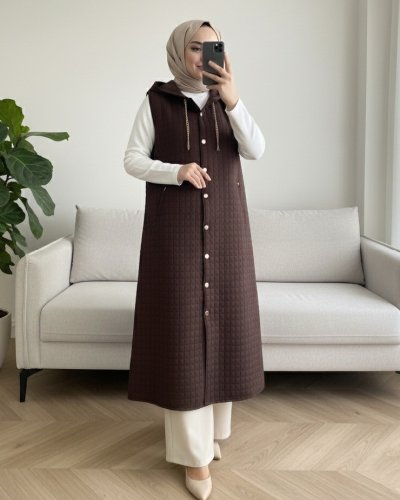 Boydan Düğmeli Kapşonlu Cepli Kapitone Uzun Yelek -K Kahve