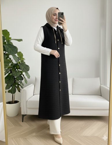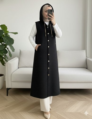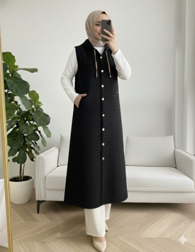 Boydan Düğmeli Kapşonlu Cepli Kapitone Uzun Yelek -Siyah