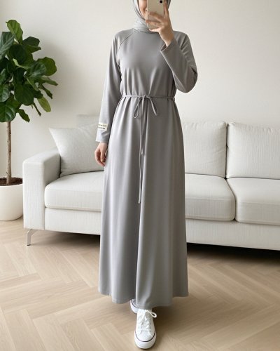 Yuvarlak Yaka Beli Bağlamalı Oysho Elbise -Gri