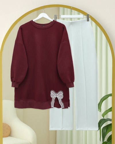 Yuvarlak Yaka Eteği Fiyonk Detaylı Salaş Penye Tunik -Bordo