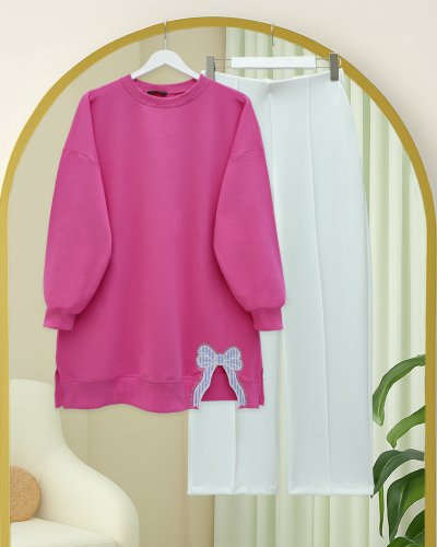 Yuvarlak Yaka Eteği Fiyonk Detaylı Salaş Penye Tunik -Pembe