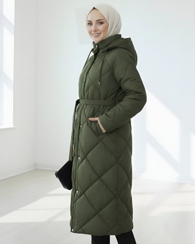 Beli Kemerli Önü Çıtçıtlı Kapşonlu Astarlı Uzun Kapitone Mont -Haki