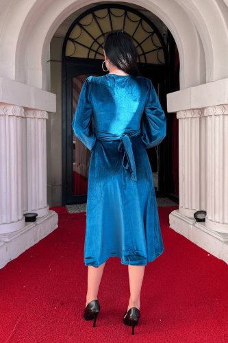 Kadın uzun kollu v yaka kuşak dahil kadife kumaş midi boy elbise