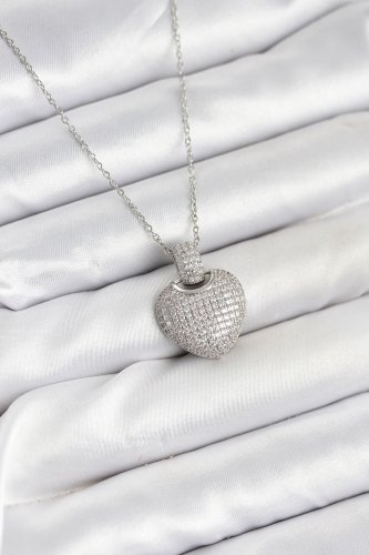 316L Çelik Zincir Gümüş Renk Zirkon Taşlı Kalpli Kadın Kolye