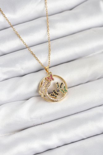 316L Çelik Zincir Gold Renk Zirkon Taşlı Kelebekli Kadın Kolye