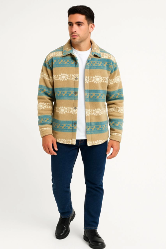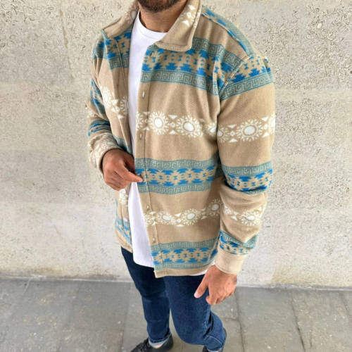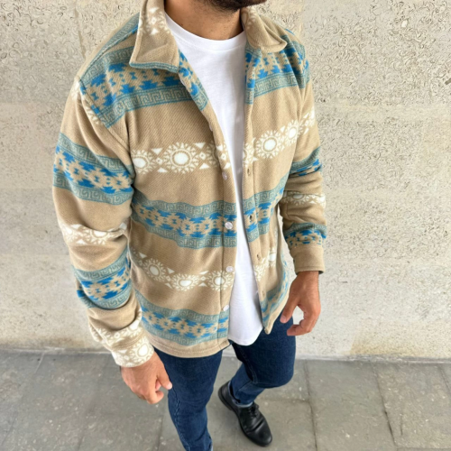 Erkek Desenli Polar Gömlek Etnik Şerit Desen Yakalı Uzun Kollu Düğmeli Oversize Rahat Kalıp - Sarı
