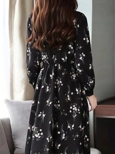 Kadın uzun kollu hakim yakalı düğmeli kuşaklı desenli maxi mikro süprem elbise