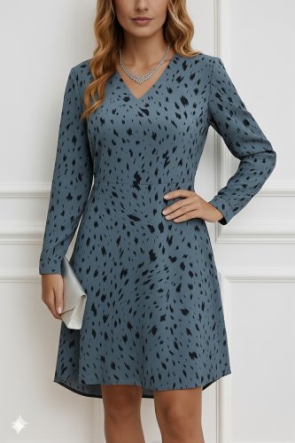 Kadın uzun kollu v yakalı desenli kısa keten elbise