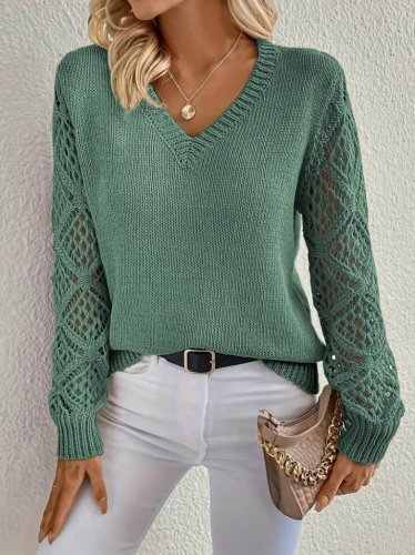 Kadın uzun kollu v yaka kol delikli baklava desen detaylı triko kazak