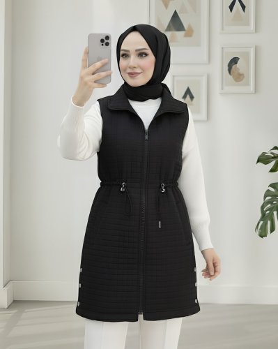 Yakası Bağcıklı Beli Lastikli Cepli Kapitone Yelek -Siyah