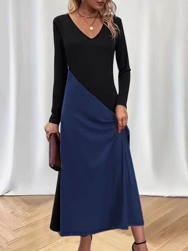 Kadın uzun kollu v yakalı blok desenli viskon elbise