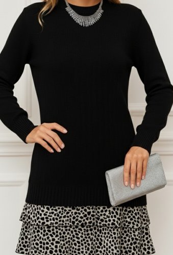 Kadın uzun kollu üst şardonlu kaşkorse alt süprem desenli elbise