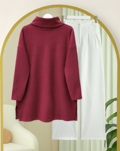 Balıkçı Yaka Yırtmaçlı Kaşkorse Tunik -Bordo