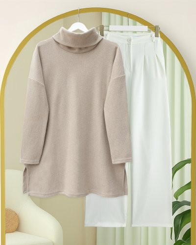 Balıkçı Yaka Yırtmaçlı Kaşkorse Tunik -Taş