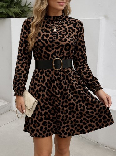 Kadın uzun kollu yarı balıkçı yaka leopar desenli kadife elbise