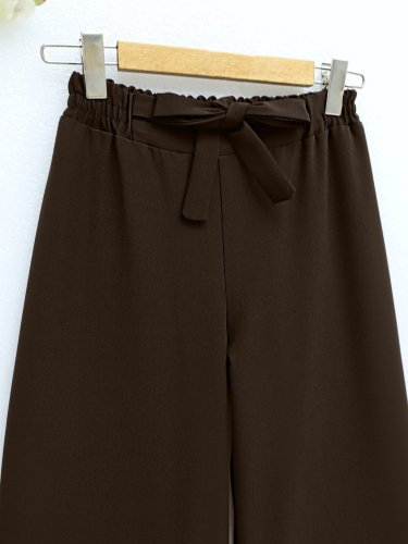 Duble Kumaş Beli Kuşaklı Bol Paça Pantolon -Kahve