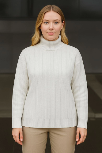 Balıkcı Yaka Bağazlı Triko Kazak Pamuklu Kalın Fitilli Dokuma - Beyaz