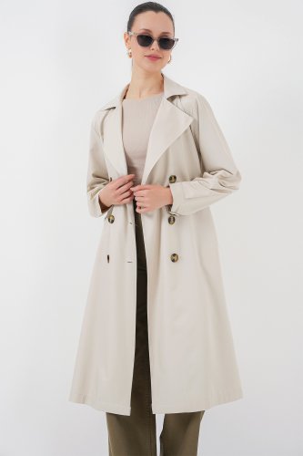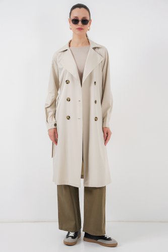 5853 Kruvaze Yaka Arkası Baskılı Trençkot - A.Bej