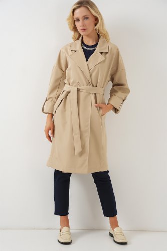 9104 Kruvaze Yaka Astarlı Trençkot - Bej