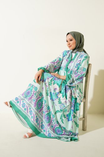 2423 Otantik Desenli Tesettür Elbise - D Mint