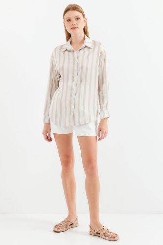 3964 Hafif Dökümlü Saten Gömlek - C. Bej