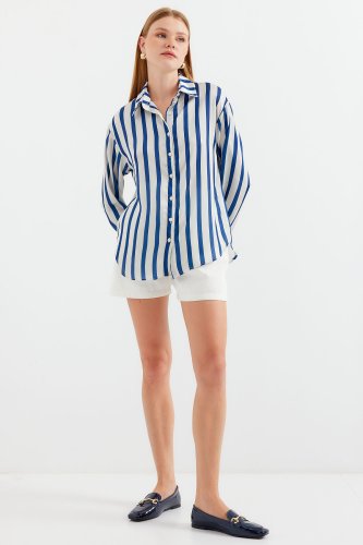 3964 Hafif Dökümlü Saten Gömlek - B.Lacivert