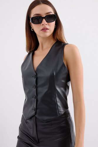 6799 Kısa Suni Deri Yelek - Siyah