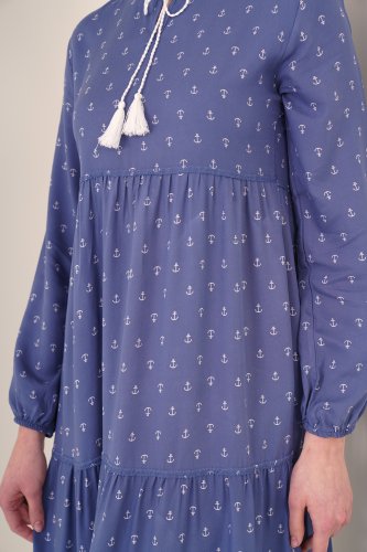 1627 Yaka Bağcıklı Tesettür Elbise - Mavi