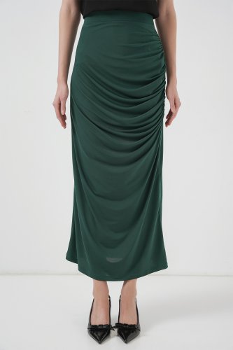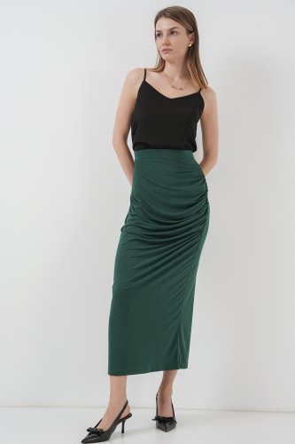 8035 Büzgülü Midi Etek - Zümrüt Yeşili