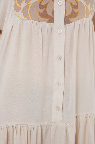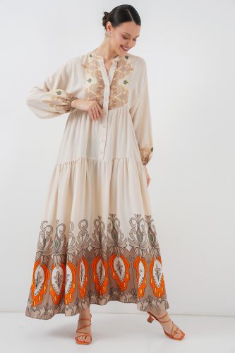 2423 Otantik Desenli Tesettür Elbise - T. Ekru