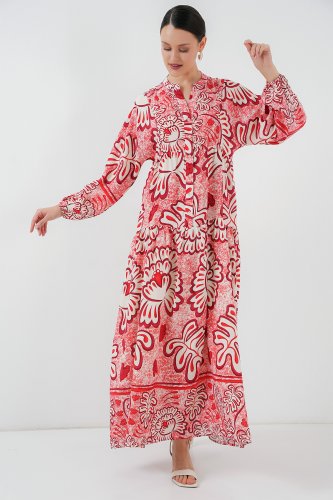 2423 Otantik Desenli Tesettür Elbise - N Kırmızı