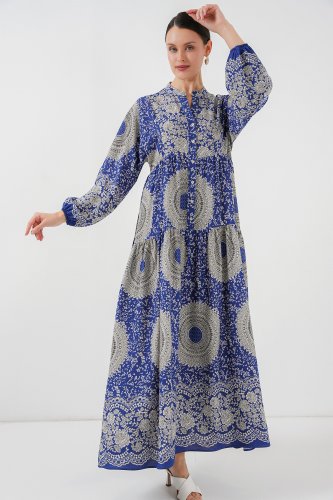 2423 Otantik Desenli Tesettür Elbise - Saks 4