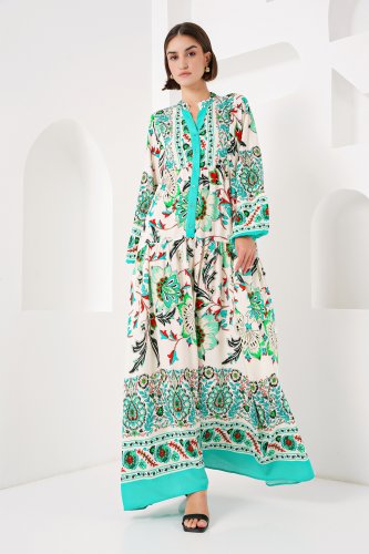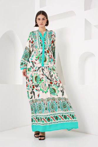 2423 Otantik Desenli Tesettür Elbise - Y.Yeşil
