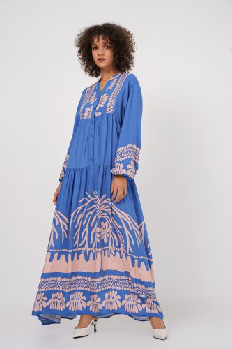 2423 Otantik Desenli Tesettür Elbise - Y.İndigo