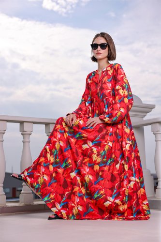 Desenli Uzun Tesettür Elbise 2585 - Kırmızı